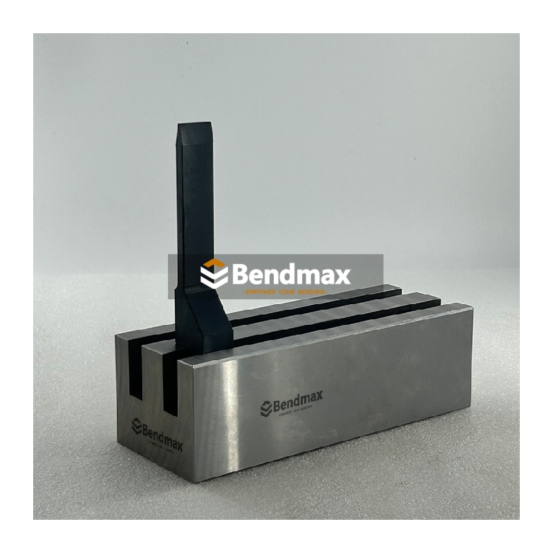 È disponibile una gamma completa di utensili standard per presse piegatrici da 120 a 30000 kN. Sono disponibili matrici a V singole, multiple e regolabili, utensili verticali rimovibili e utensili speciali per applicazioni personalizzate. Bendmax produce utensili di alta qualità, rettificati con precisione e realizzati con i migliori materiali per garantire massima resistenza e lunga durata. IL Matrice per piegatrice a V singola stile LVD Realizzata in acciaio per utensili temprato 42CrMo, questa matrice a V è progettata per la formatura di angoli acuti in componenti di precisione in lamiera utilizzati in alloggiamenti elettrici, componenti hardware e lavorazioni leggere. Quando si sceglie questo tipo di matrice a V, assicurarsi che l'apertura a V corrisponda allo spessore del materiale e al raggio interno desiderato per ottenere risultati accurati senza sovraccaricare la matrice. Per prestazioni ottimali, gli operatori devono mantenere pulite le superfici della matrice, assicurarsi del corretto allineamento della matrice ed evitare di superare i limiti di carico della pressa piegatrice per prevenire usura prematura o incoerenze angolari.